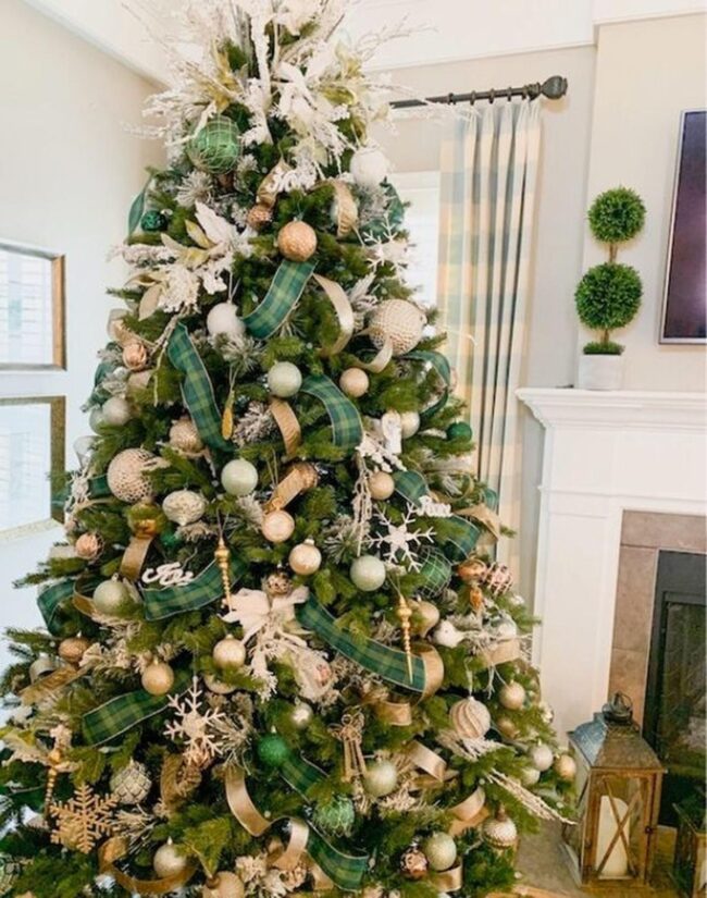 Christmas magic unfolds in a living space where a towering tree radiates enchantment with sparkling gold, green, and cream ornaments dancing among dark green plaid ribbons.