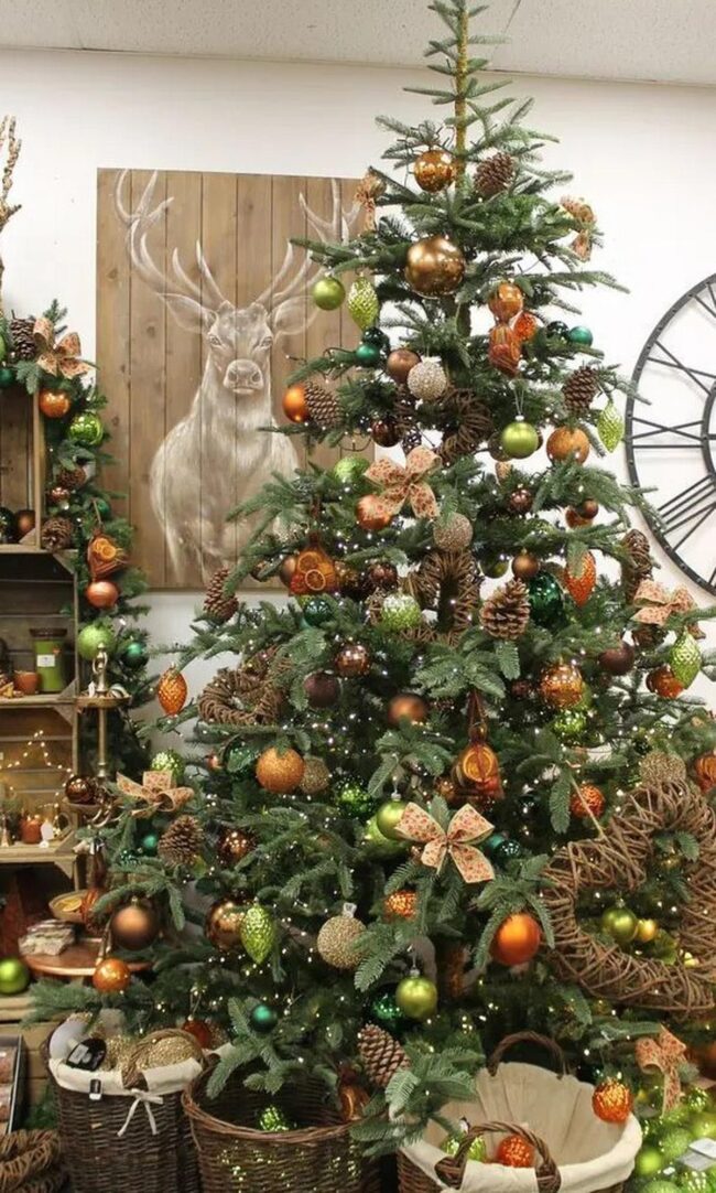 Sparkling red and gold ornaments peek out from branches, catching light and drawing curious eyes across their natural silhouettes.