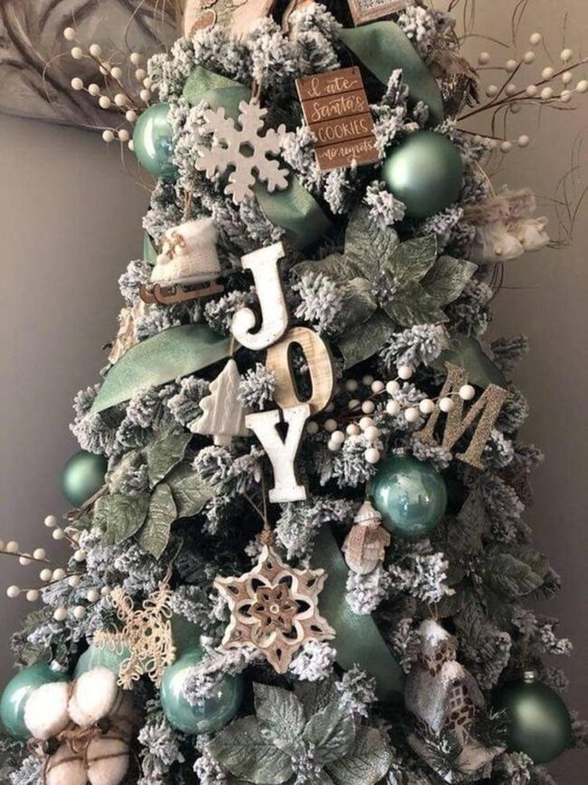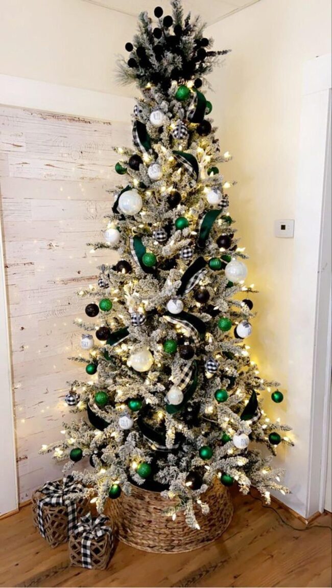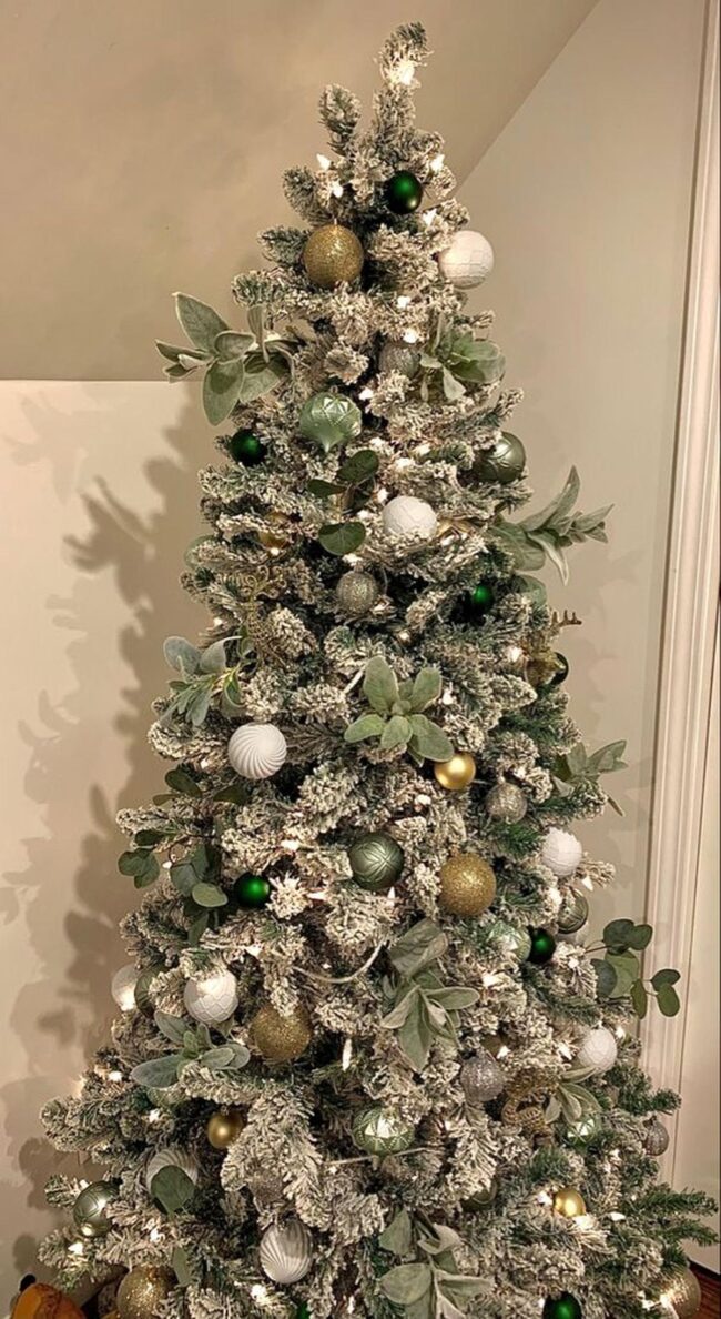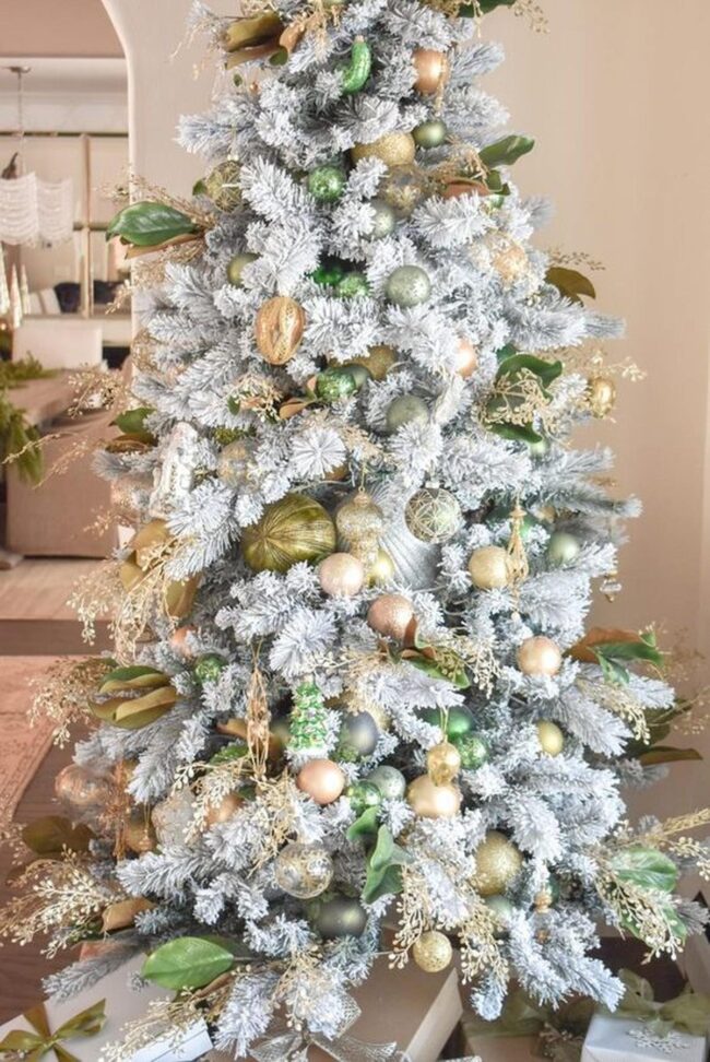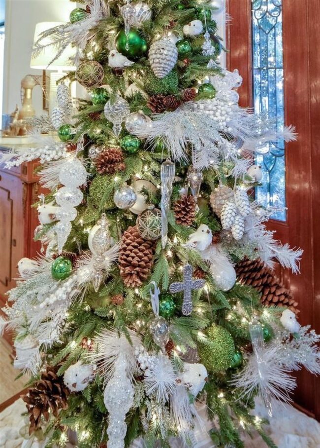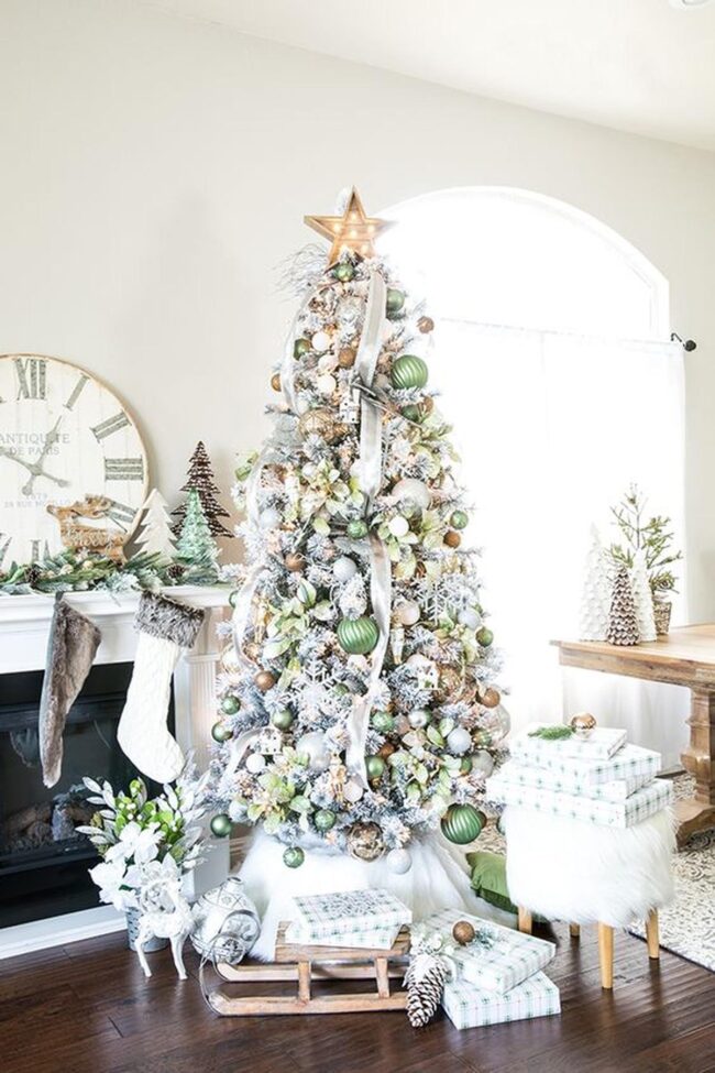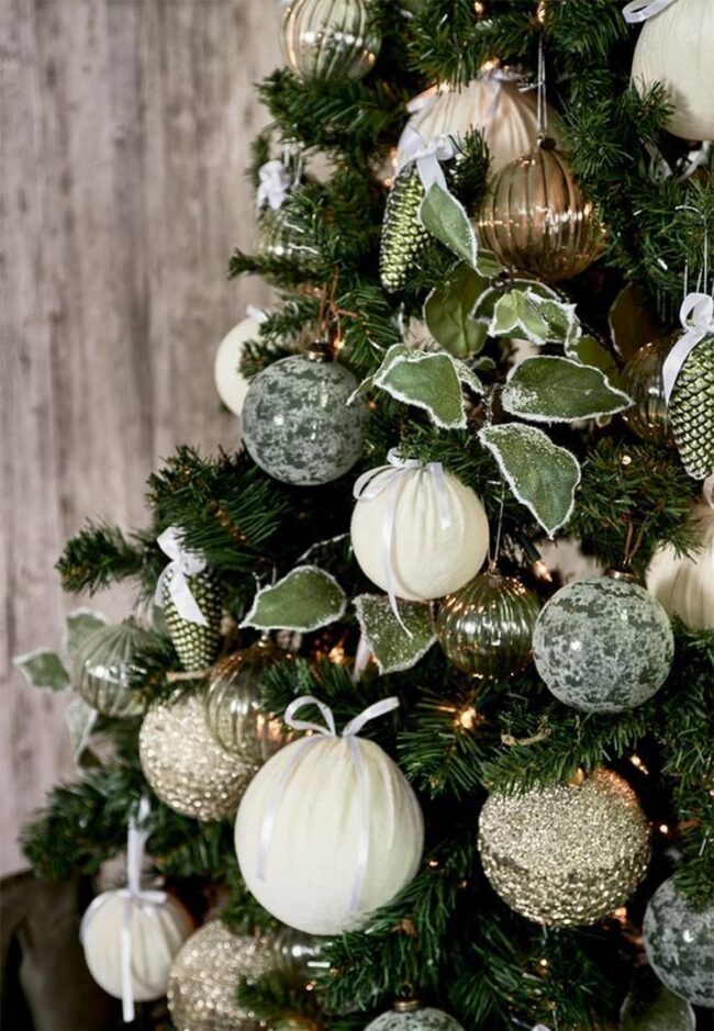 White and green ornaments cascade gracefully on the Christmas tree, creating a harmonious visual symphony with natural wooden accents and delicate frosted leaves.