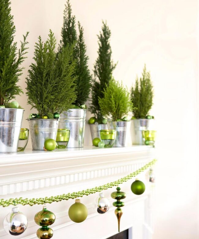 Green topiary plants perched on the mantel introduce natural whispers without overwhelming the festive scene.