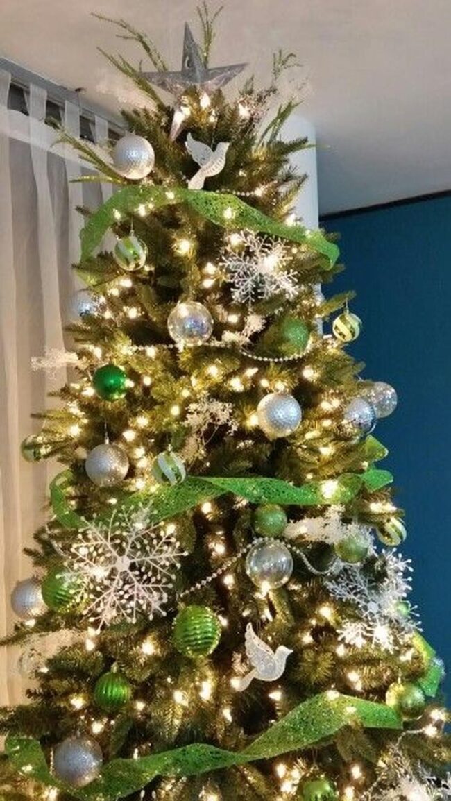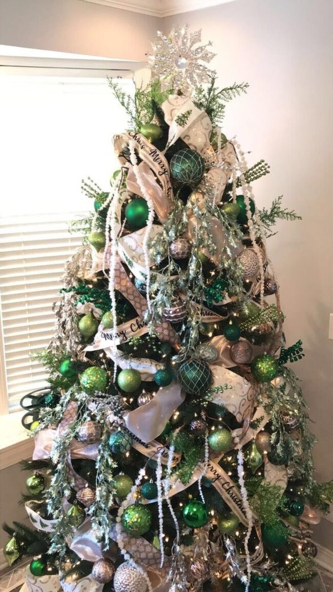 Green and white ornaments cascade down a beautifully decorated Christmas tree, drawing attention with delicate flowers and ribbons that sparkle against the pristine background.