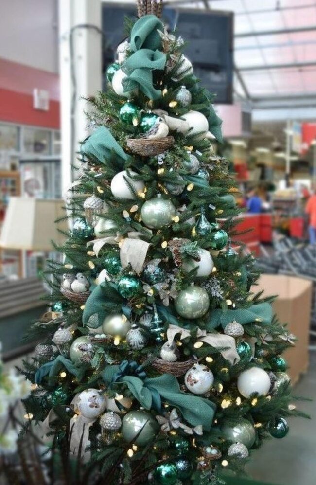 Natural elements like feathered friends and organic textures redesign an ordinary tree into a spectacular display of festive creativity.
