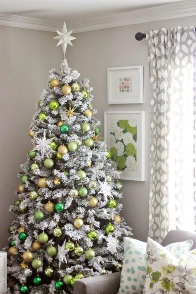Delicate ornaments in rich green and golden tones shimmer like jewels, catching every ray of light and drawing curious eyes across the room.