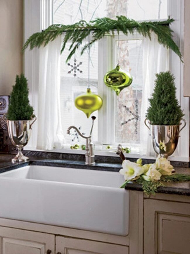 Sunlight streams through kitchen windows, casting magical sparkles on delicate silver pots housing petite evergreen trees that instantly elevate the entire space.