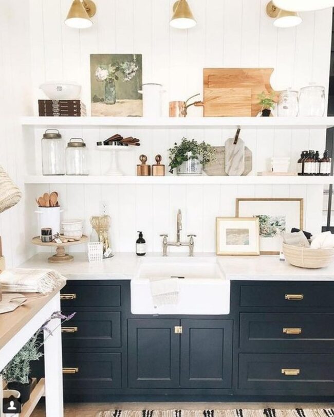 Dark blue cabinetry paired with gleaming brass handles immediately draws your eye across the room's landscape.