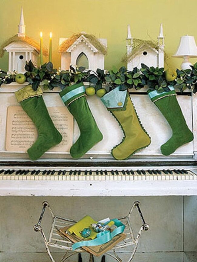 Cheerful stockings in fresh green and light blue hang gracefully, inviting festive cheer into your space.