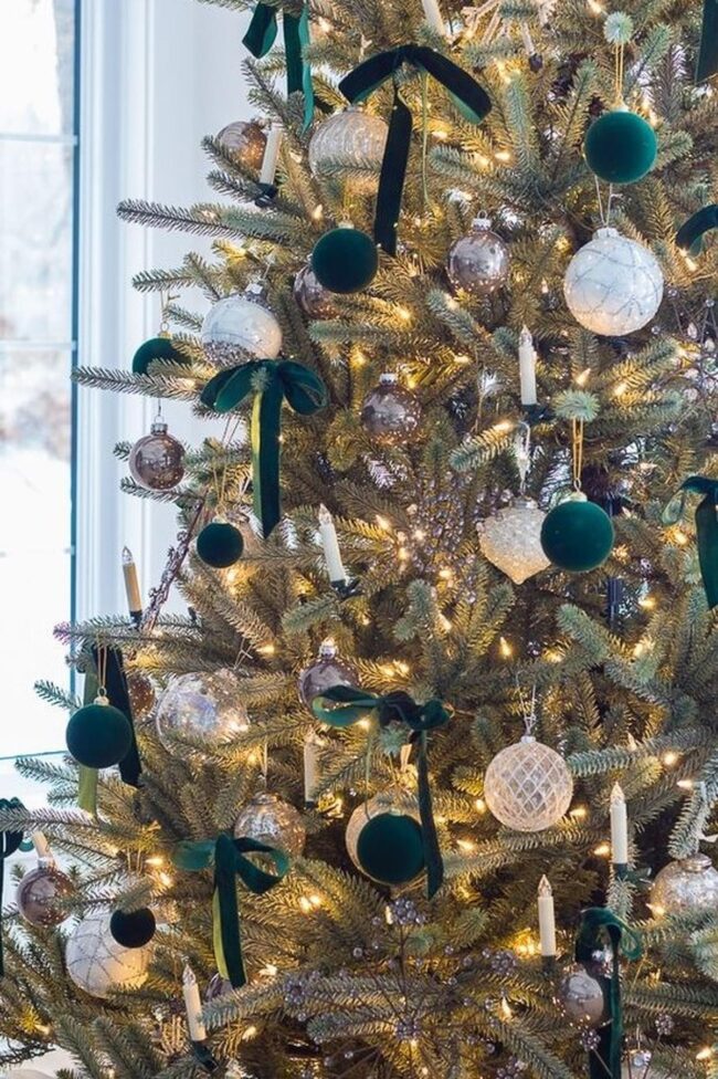 Silver and green ornaments dance across evergreen branches, casting magical reflections that instantly draw your eye into a winter wonderland.