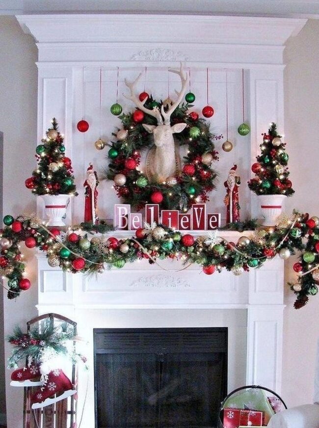 Wooden blocks spelling "Believe" perch atop the mantel, infusing a heartfelt message into the holiday scene.