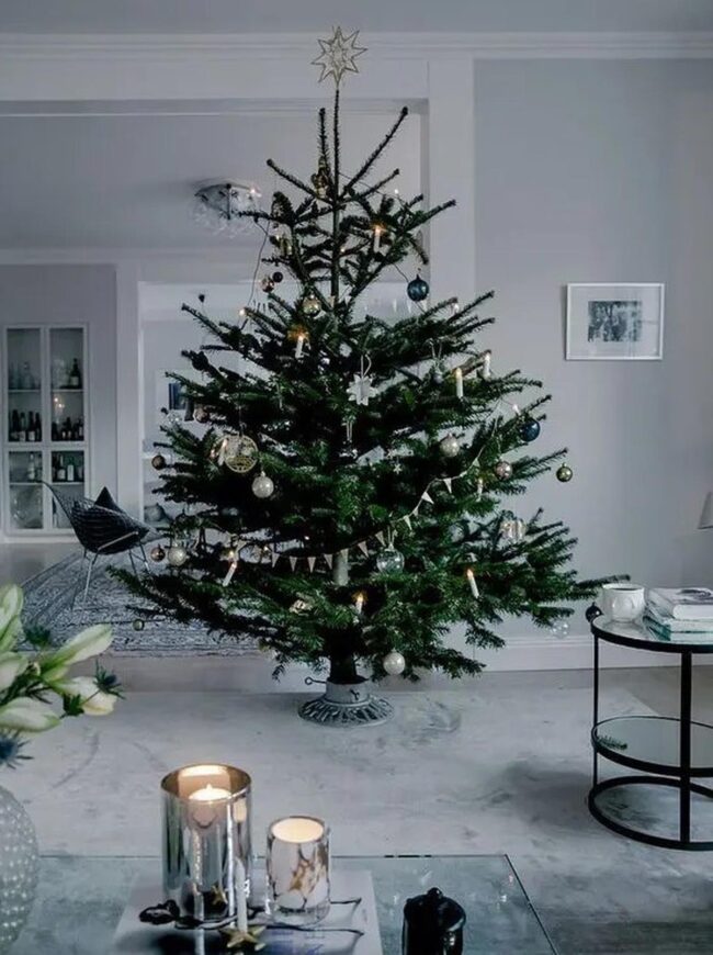 Silver-kissed ornaments dance on a majestic tree, catching sunlight and casting enchanting shadows across cream-colored walls that feel like a warm embrace.
