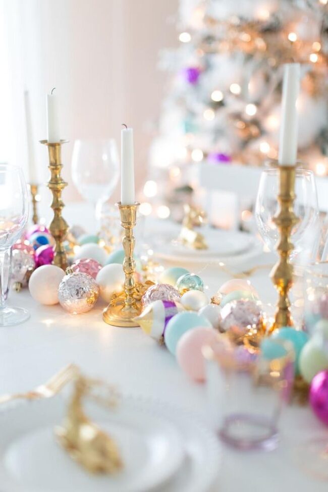 Sparkling ornaments in soft pink, teal, and gold dance with light, creating mesmerizing centerpieces that feel both sophisticated and playful.