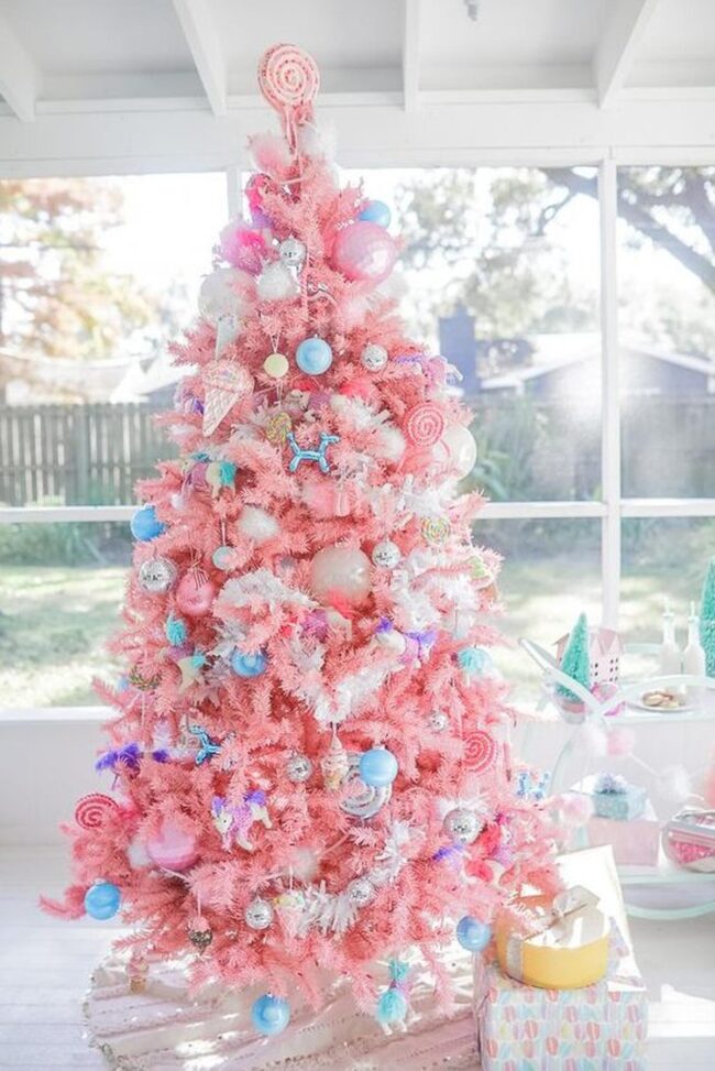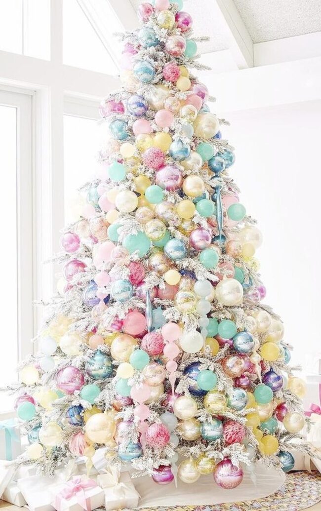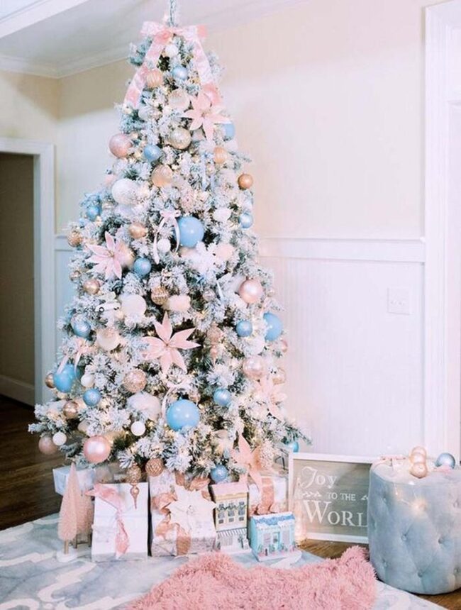 Soft pastel ornaments in dreamy blue, sunny yellow, and cotton candy pink dance across branches, creating a whimsical candy-land feel that instantly catches eyes.