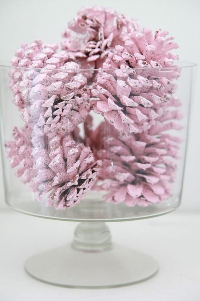 Pink pine cones nestled in a crystal-clear pedestal bowl instantly elevate your home decor with understated woodland charm.