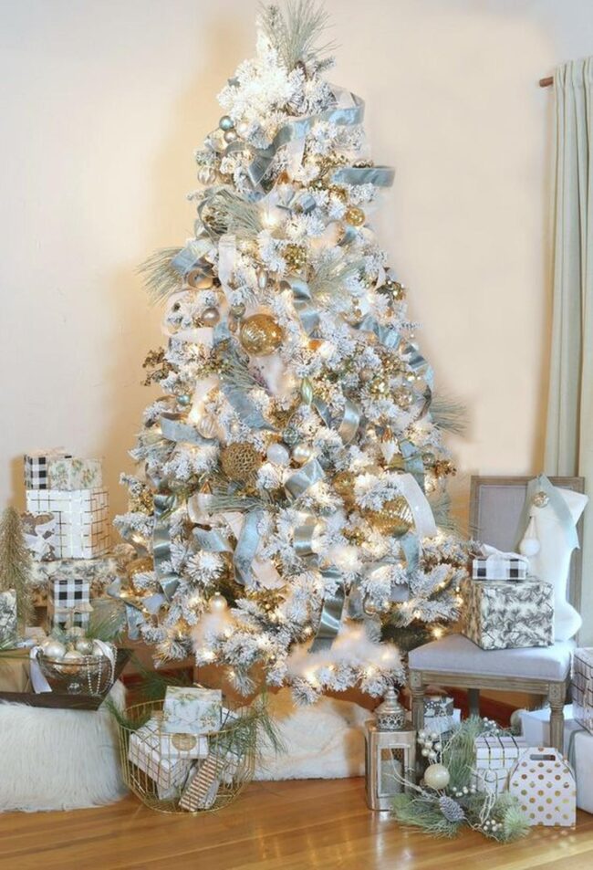 Christmas enchantment dazzles in this magical room where a frosted evergreen tree radiates pure holiday joy with shimmering gold and silver ornaments dancing between delicate light blue ribbons.