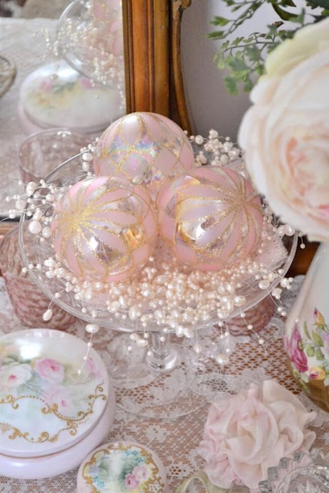 Soft pink and gold glass ornaments sparkle inside a crystal dish, surrounded by pearly beads that instantly catch your eye.