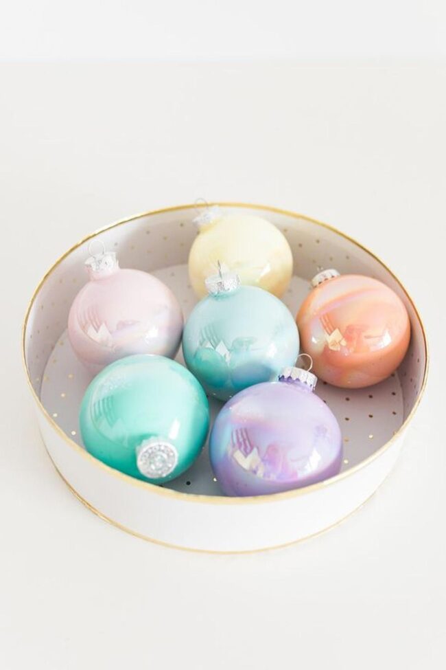 Pastel ornaments whisper holiday enchantment with their smooth, glassy surfaces that dance with light in unexpected ways.