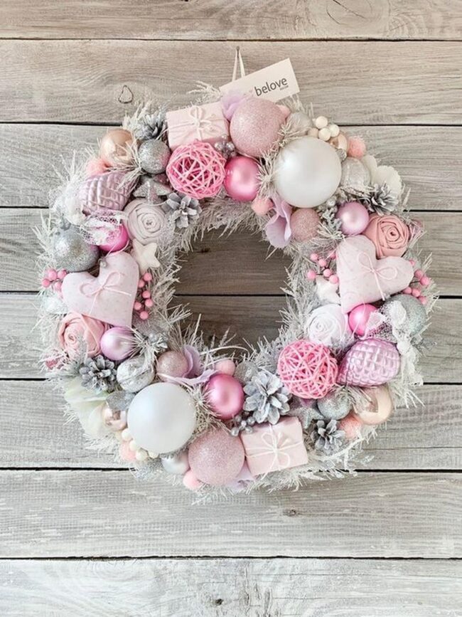 Soft pink, pristine white, and shimmering silver dance together in a holiday wreath that instantly captivates your attention, weaving hearts, delicate balls, and miniature gift boxes into a mesmerizing display.