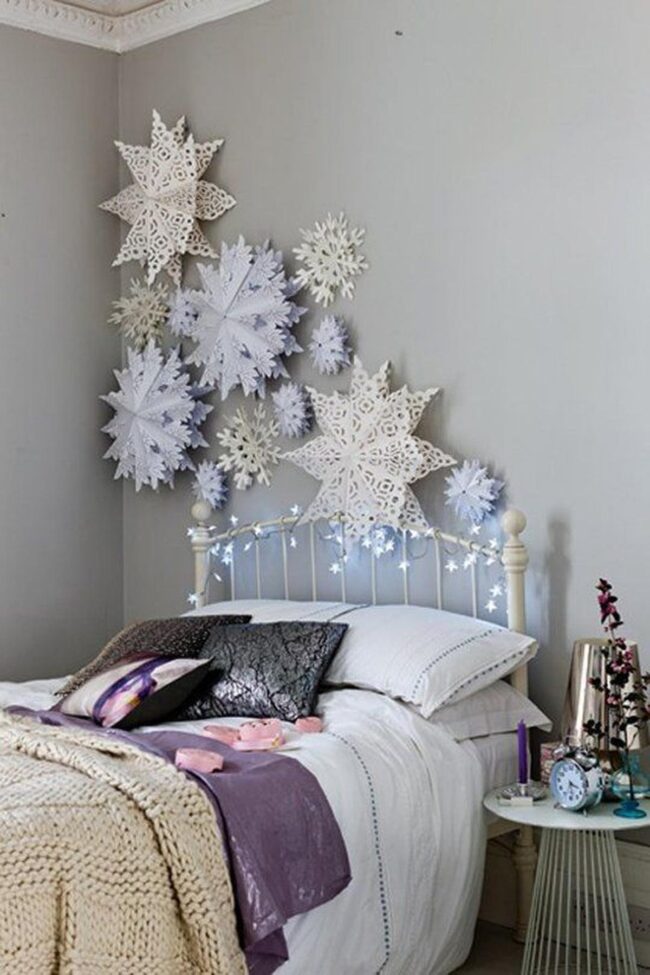 Delicate paper snowflakes scattered above the headboard bring playful winter magic through their intricate silhouettes.