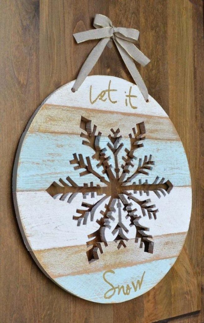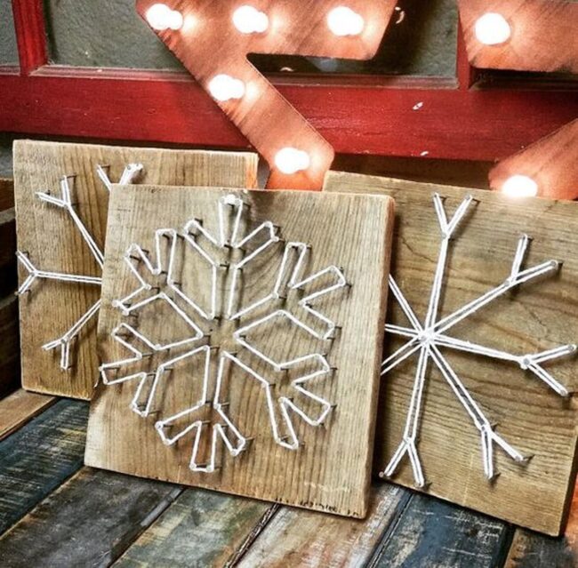Wooden round surfaces become stunning canvases for delicate snowflake designs that catch every passing glance.