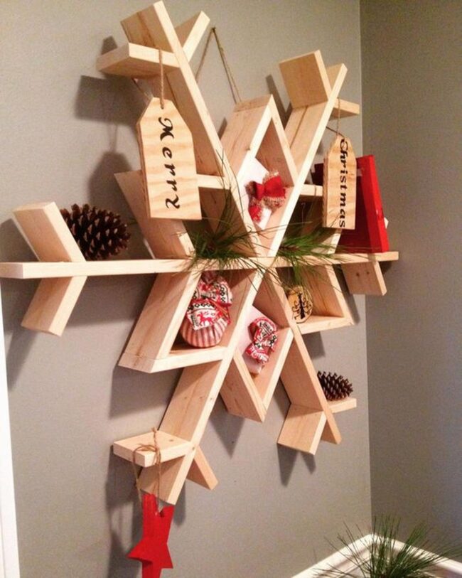 Wooden snowflake shelves become magical holiday centerpieces that sparkle with winter magic, drawing eyes and smiles across any room.