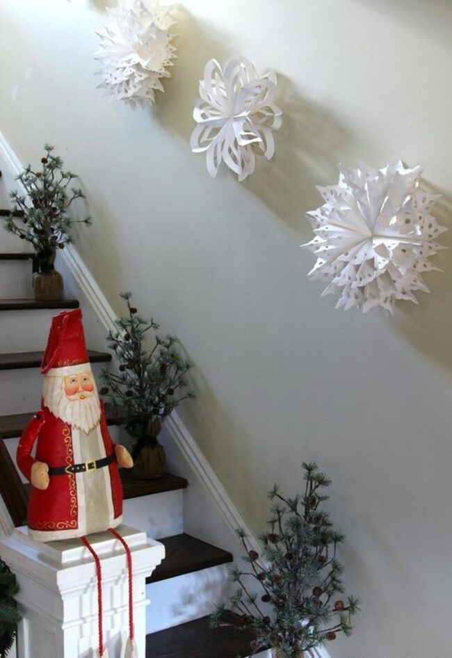 Wooden stairs change into a magical holiday sanctuary with oversized white snowflake ornaments that radiate seasonal magic.