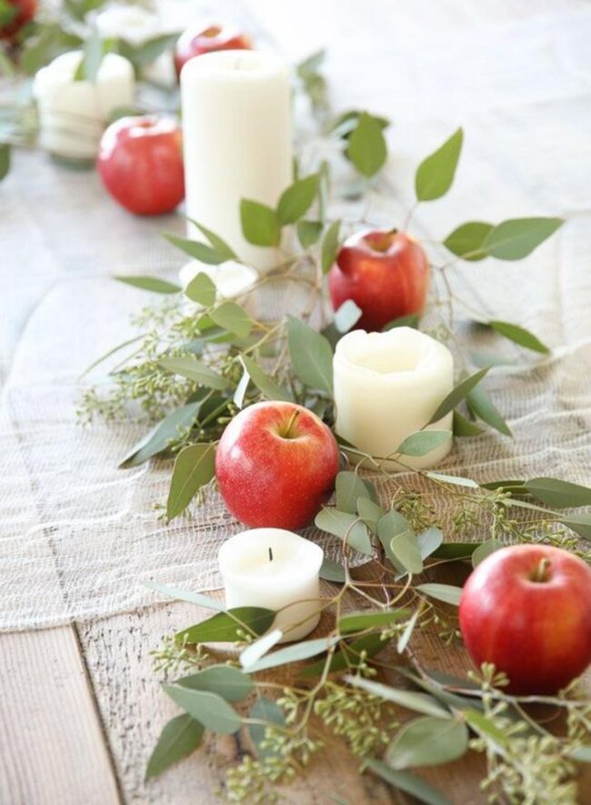 Strategic pops of red apples dance between soft green leaves, creating visual conversations that feel effortlessly sophisticated.
