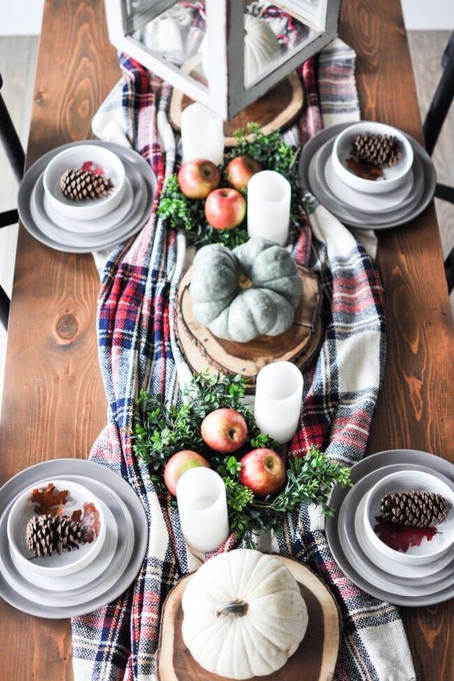 Plaid runners cascade over wooden surfaces, introducing deep earthy tones that feel like a gentle autumn embrace.