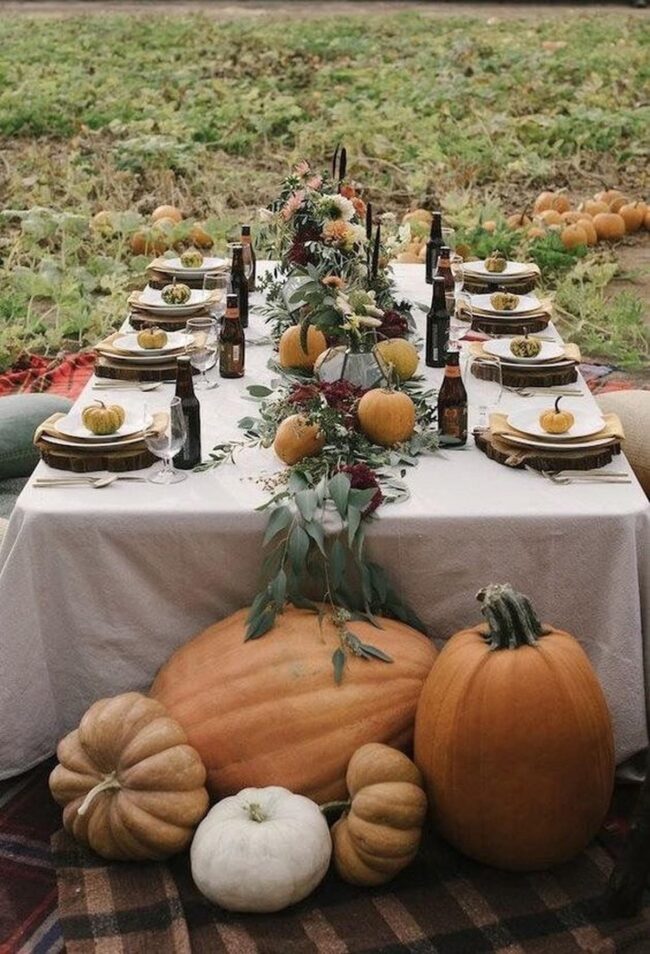 Small pumpkins nestled beside carefully arranged plates whisper stories of harvest gatherings and intimate moments.