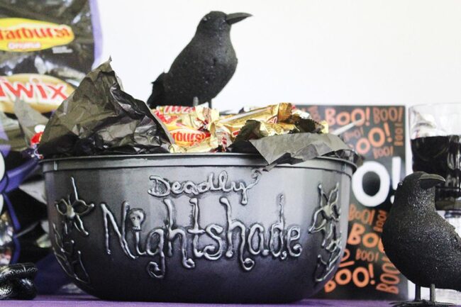 Dark ceramic bowls loaded with golden and red candy bars become mesmerizing centerpieces that instantly spark Halloween magic.