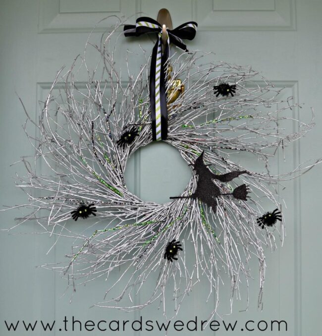 Witches on broomsticks perch mysteriously on wreath edges, bringing classic Halloween charm to your entrance.