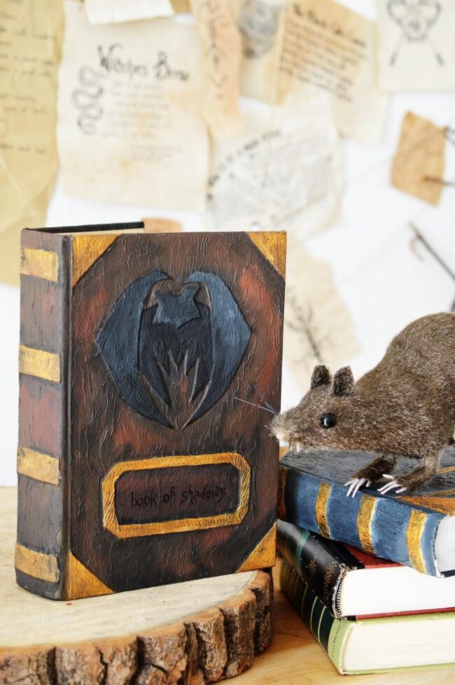 Delicate parchment papers hanging nearby suggest secret narratives waiting to unfold, while a charming mouse figure adds unexpected whimsy to the scene.
