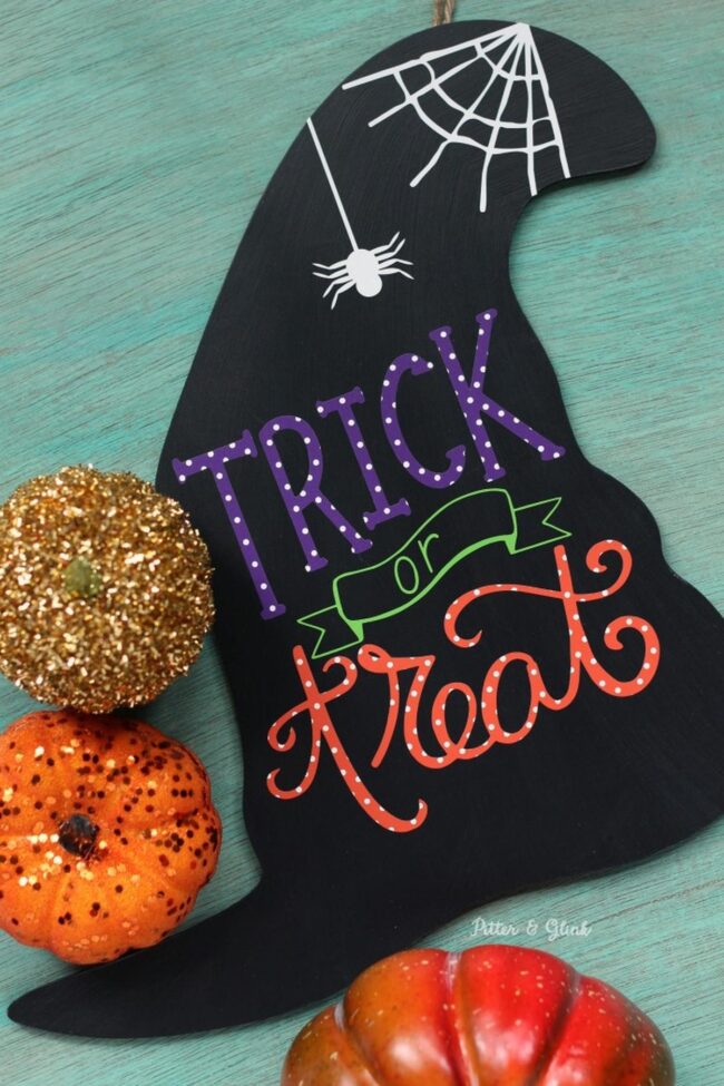 Crafty black surfaces pop with vibrant purple, green, and orange letters spelling out "Trick or Treat" in delightful Halloween spirit.