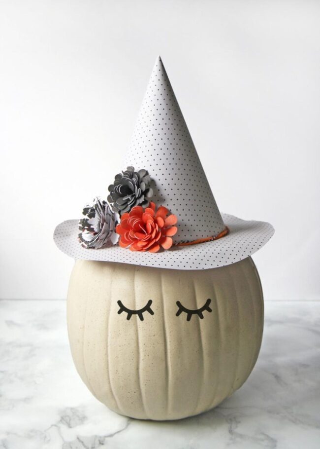 Black eyelashes enhance a cream pumpkin into a character with adorable sleepy charm, while a crisp white witch hat tilted at a playful angle becomes an instant conversation starter.