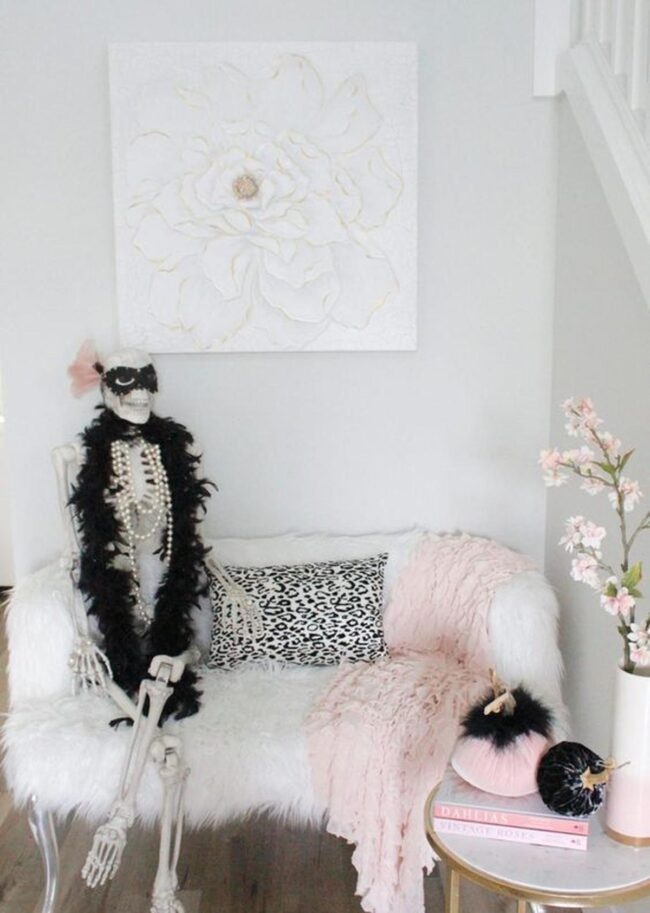 Unexpected design touches like a feathered skeleton draped in pearls can instantly beautify your space into a conversation starter.