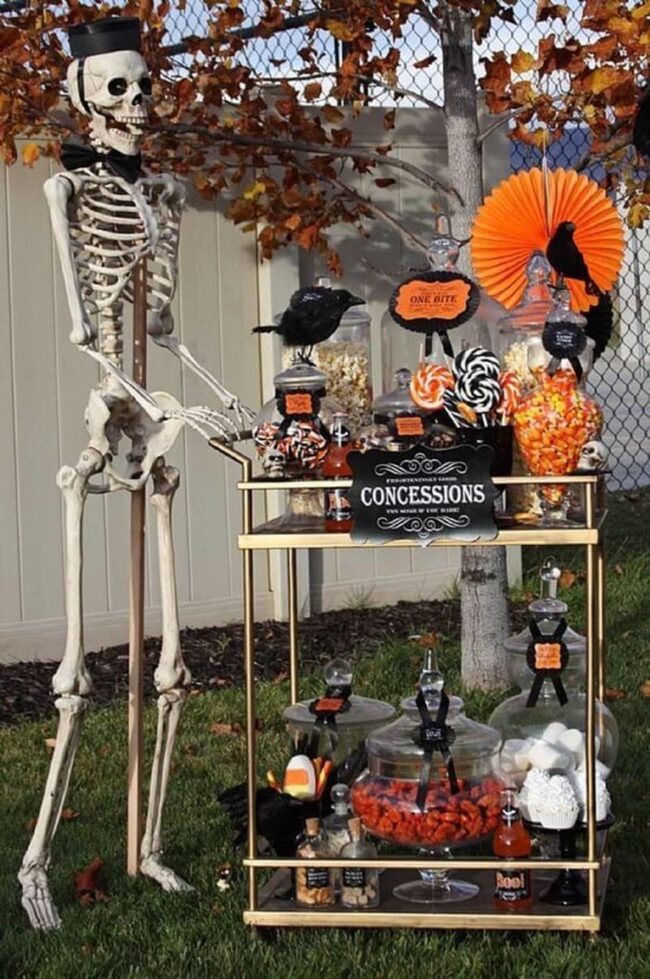 Small black-hatted skeletons stand guard near overflowing candy carts, creating delightful centerpiece moments that spark joy and wonder.