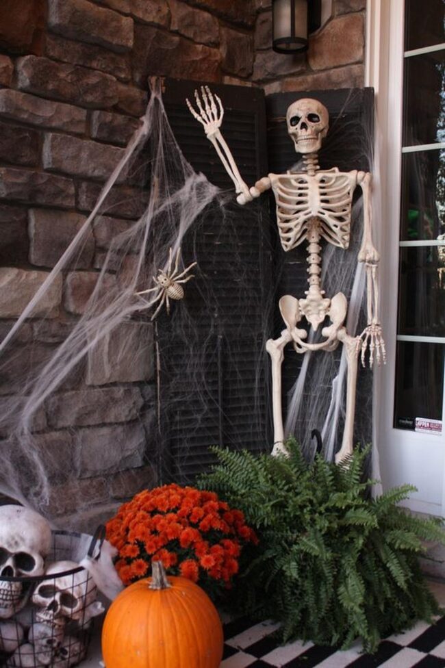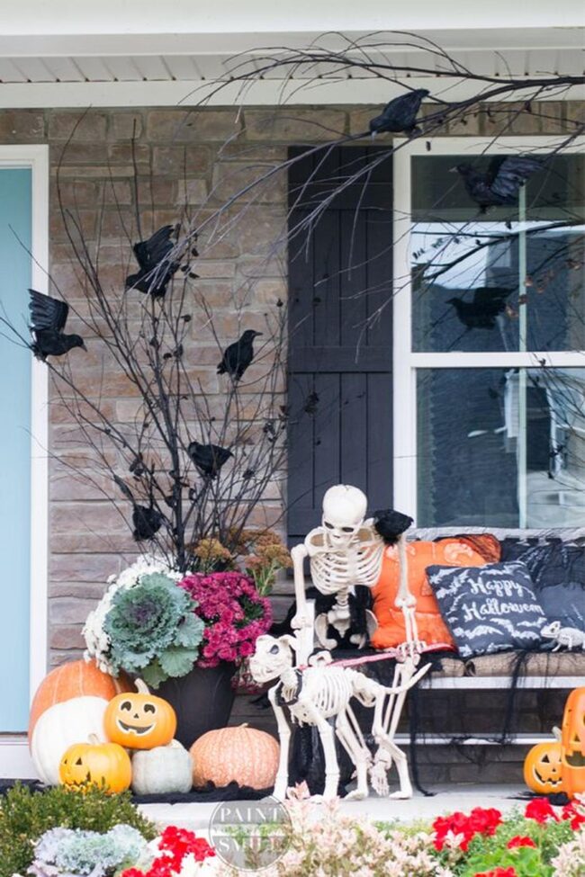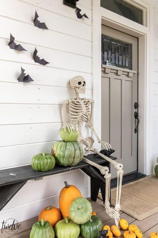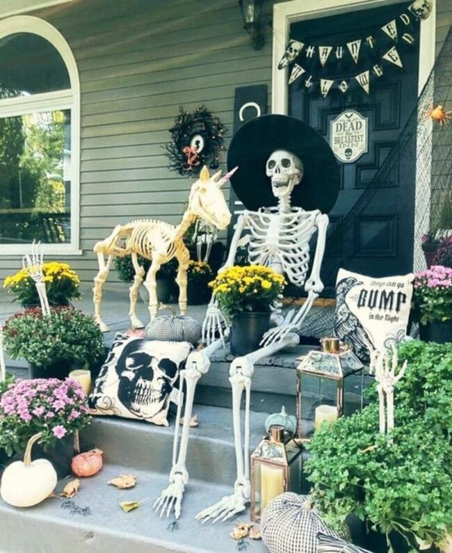 Halloween vibes come alive with a skeleton scene that radiates quirky personality on your front porch.