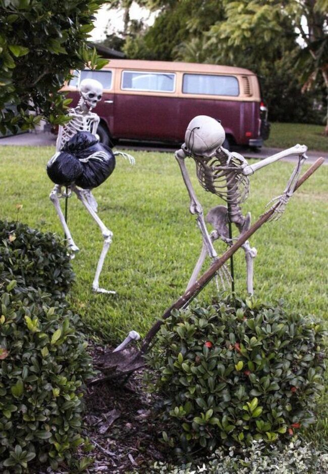 Nearby, another skeleton casually works an old wooden shovel among lush green bushes, adding delightful storytelling elements to your outdoor space.