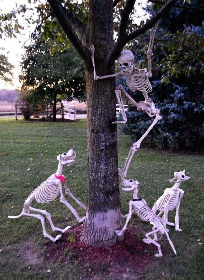 One climbing skeleton dramatically grips tree branches, showcasing whimsical movement that feels both surprising and engaging.