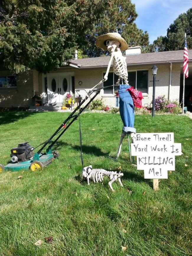 Skeletal characters strategically placed across grassy landscapes become conversation starters with their unexpected comedic positions - like a bony figure casually lounging on a bright red lawn mower.