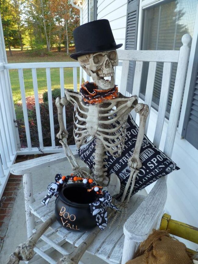 Spooky seasonal porches burst with personality when skeleton friends take center stage, sporting dapper accessories like tall black hats with striped ribbons and oversized bows.