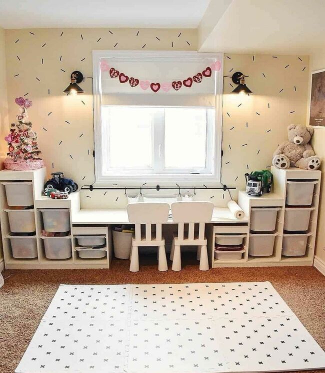 Clever storage options help maximize every inch of space, making toys and supplies easily accessible yet neatly tucked away.