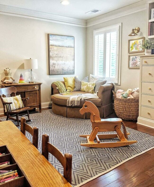 Soft grey and black farmhouse rugs spread comfort across the floor, inviting little feet to explore.
