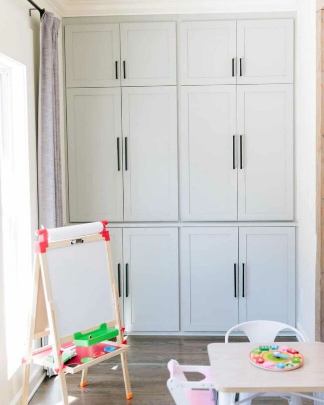Playful white shaker cabinets command attention in this kid-friendly space, stretching from floor to ceiling with smart storage solutions.