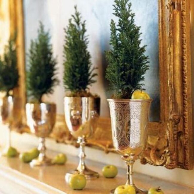 Metallic silver goblets paired with miniature green trees create stunning landscapes that captivate your senses.