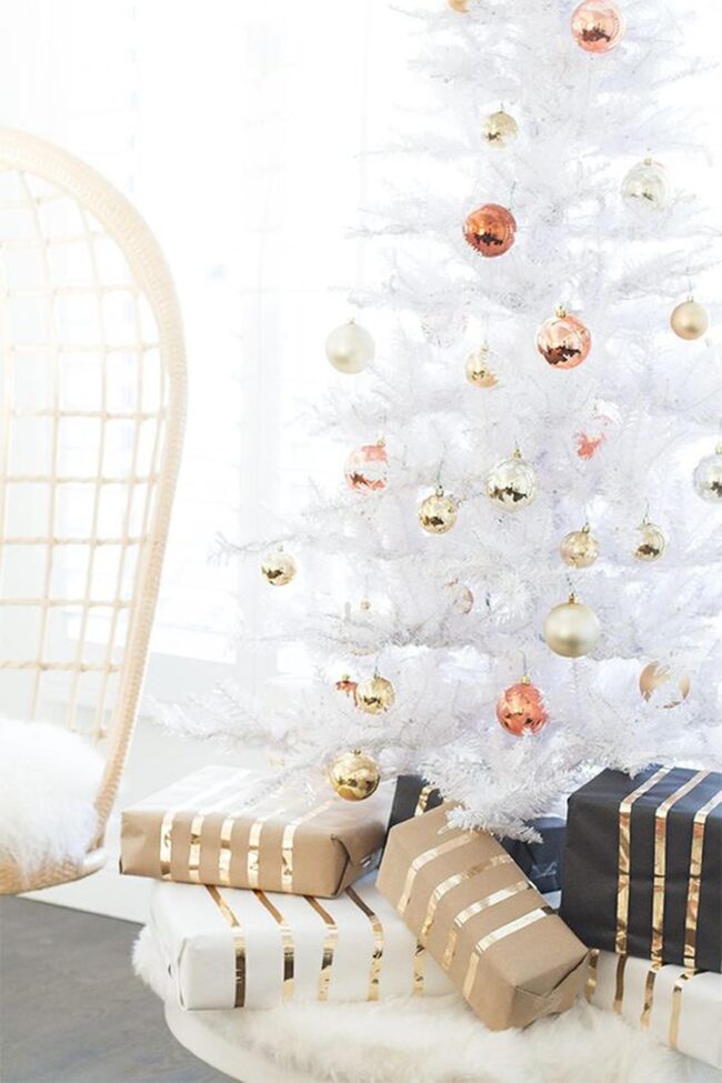 Carefully wrapped presents tucked underneath look sophisticated with their pristine white paper and striking black ribbon accents.