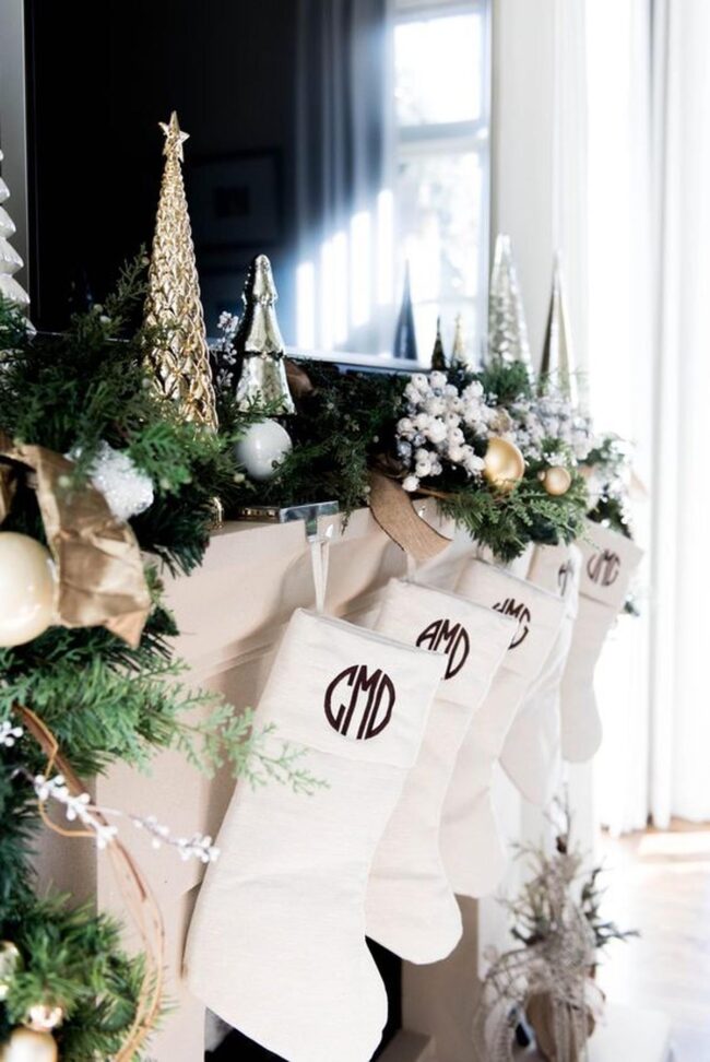 Soft white stockings dangle gracefully from the fireplace mantel, nestled beside fresh evergreen sprigs and twinkling lights that cast a gentle radiance.
