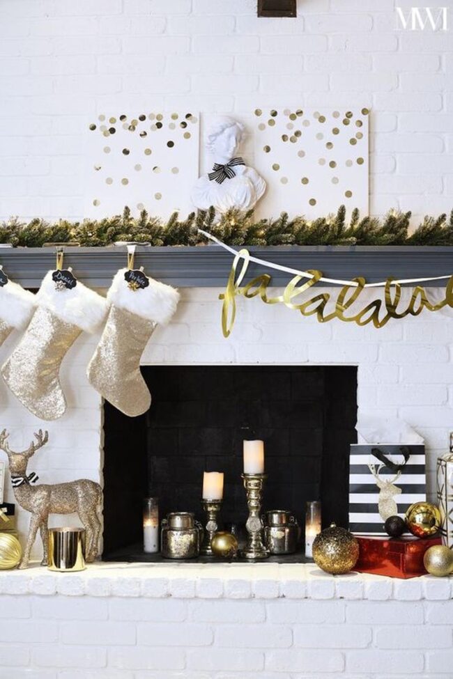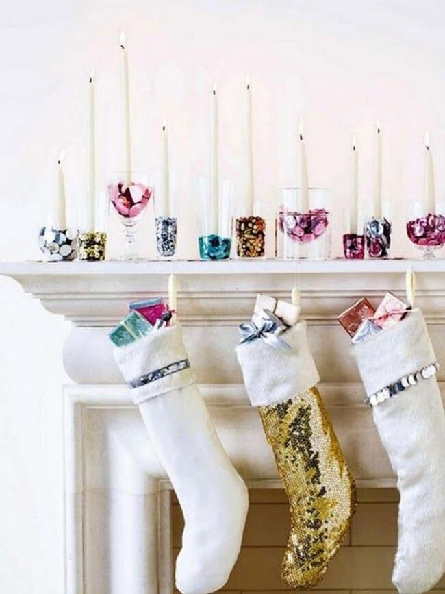 Mixing gold sequined stockings with soft white fabric ones adds unexpected visual intrigue and delightful contrast to your decor.