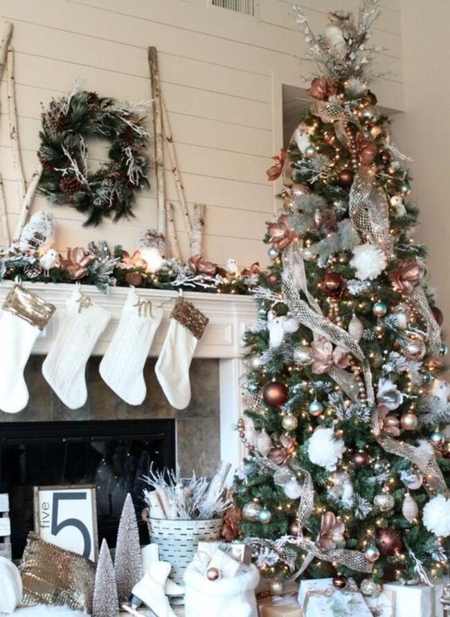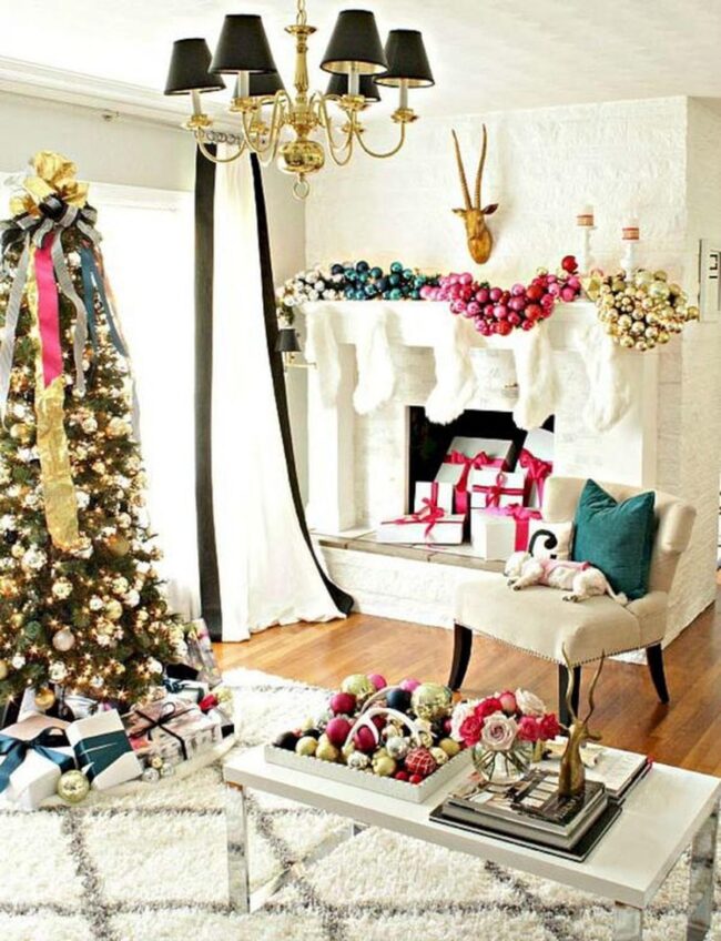 Shimmering metallic ornaments cascade along fireplace edges, infusing luxurious sparkle into every corner.