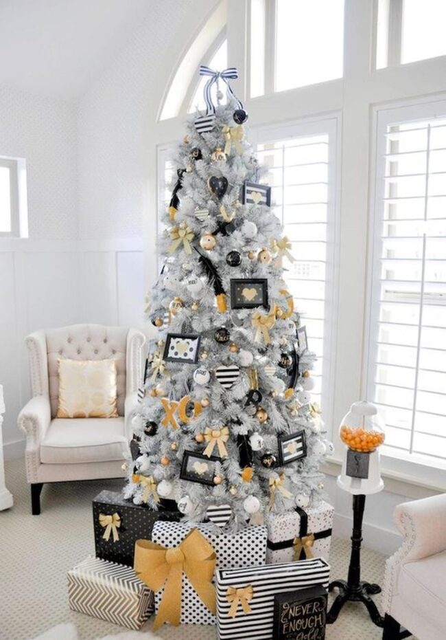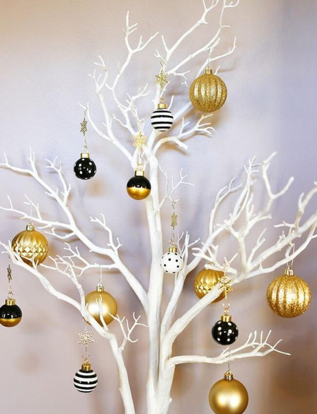 Striking ornaments in black, gold, and metallic stripes catch light beautifully against crisp white tree branches, drawing everyone's gaze instantly.