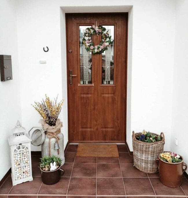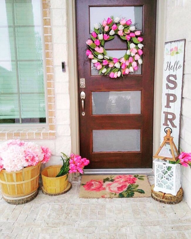 Classic spring wreaths hung on front doors complete the decorative ensemble, weaving together natural elements and decorative touches.