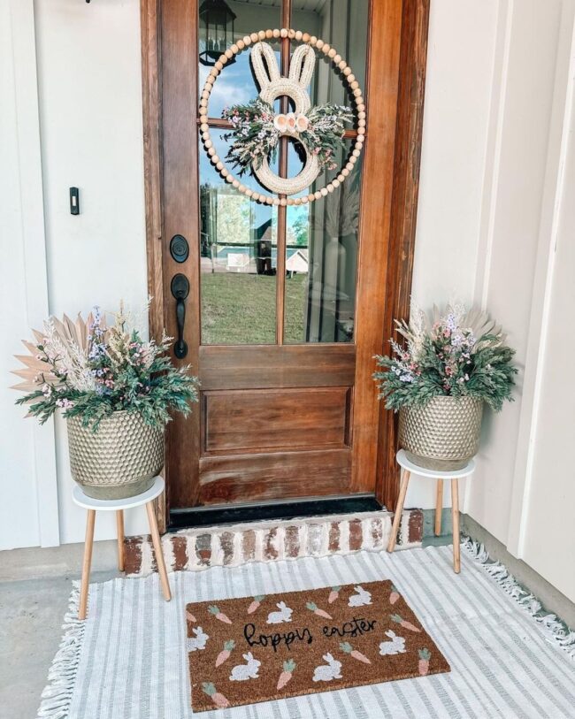 Handcrafted beaded bunny wreaths add whimsical character and playful detail to exterior walls or door frames.